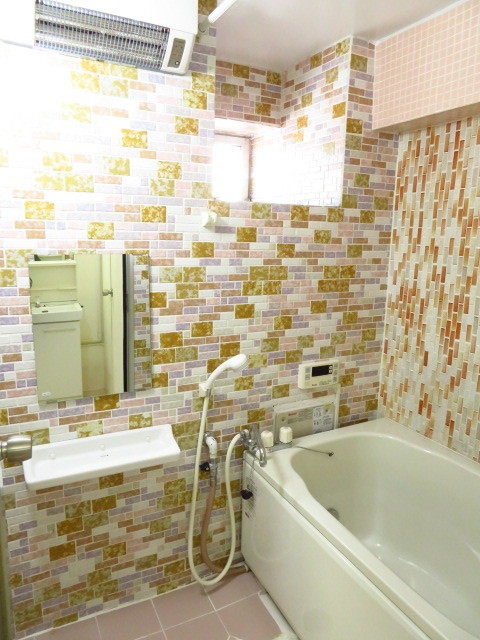 浴室の壁は、オシャレなタイルが貼られています。床はピンク色で、パッと明るい印象を与えてくれます。