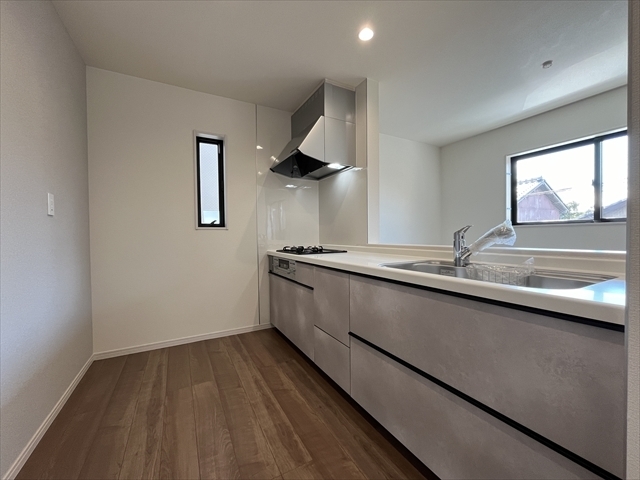 キッチンと壁紙は、淡いくすみグレー系で統一され、落ち着いた印象◎