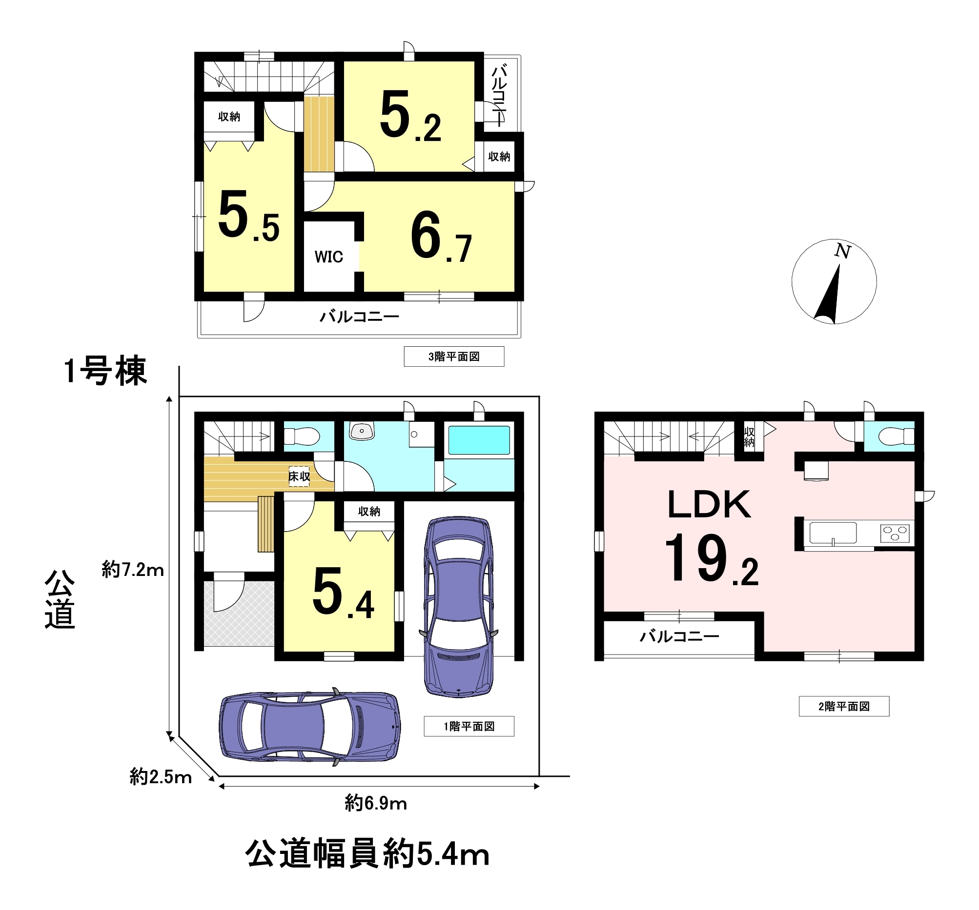 4LDKの間取り、駐車は2台可能な3階建て。