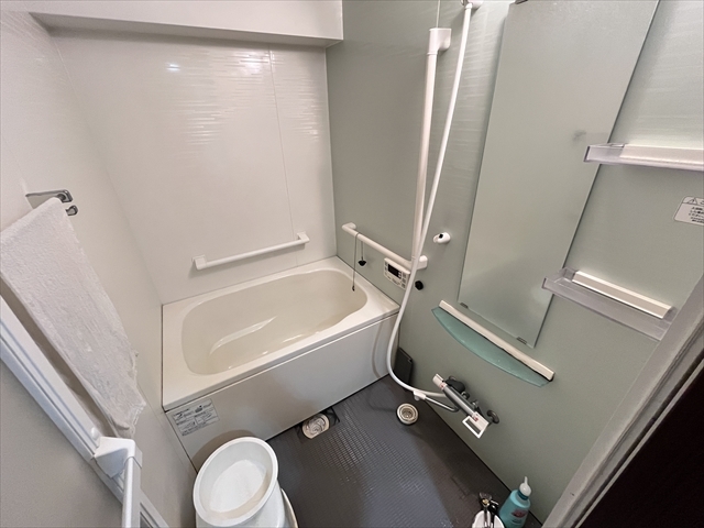 清潔感があり、お手入れしやすい浴室です。棚や小物を置くスペースもついているので、シャンプーなどを置くのに便利ですね。