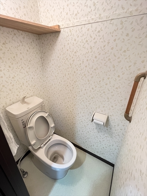 壁紙にアクセントがあり、明るい印象に◎上部に棚が備え付けられていますので、トイレットペーパーのストックなど置くことができます。