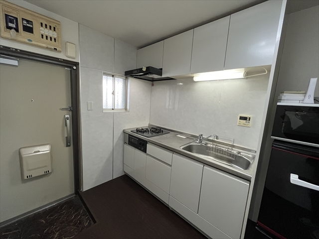 白色のスッキリとしたシステムキッチンです。綺麗にお使いいただいています。小窓を開けて風を通すこともできます◎