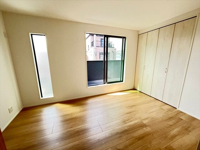 7.4帖洋室:ハンガーパイプ付きのクローゼット完備。お部屋の入口横にはカウンターが備え付けられています。小物を飾ったり、机としても使えますね◎新たに家具を買わなくても良いので、嬉しいですね。