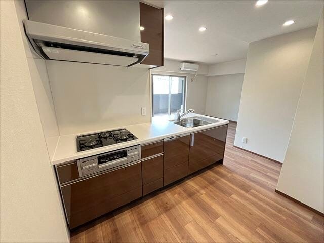 光沢のあるシステムキッチンで高級感があり、オシャレな雰囲気に♪食洗器・ディスポーザー付きで機能的。生ごみが出ないのが魅力です!