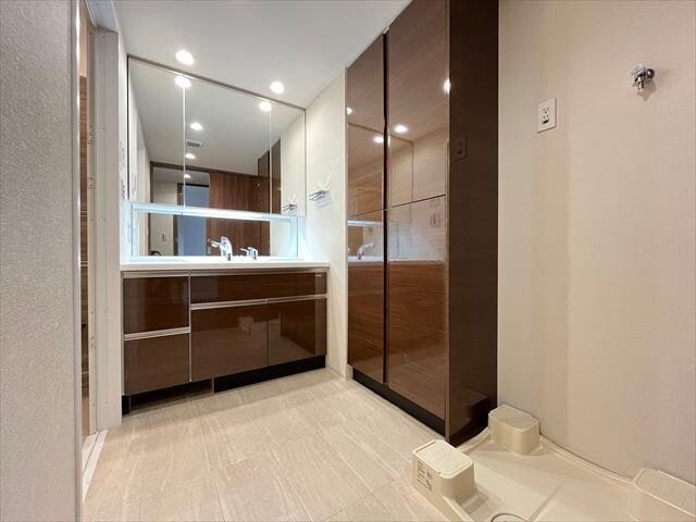 洗面スペースもキッチンと同色で落ち着いた雰囲気に♪大型ミラーに、収納棚も付いています。毎日早起きするモチベーションがあがりますね♪