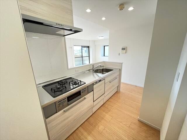お部屋になじむ白色のクリナップ製システムキッチン♪食洗器・浄水器・3つ口コンロ付きで機能的◎