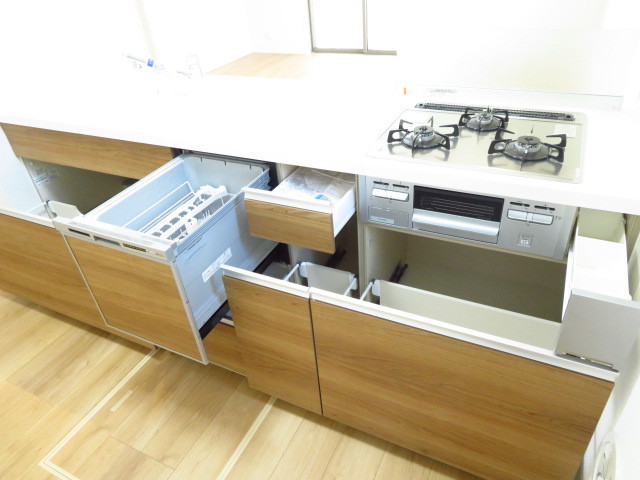 使い勝手が良いガスの3つ口コンロに、人気の食洗機を搭載!