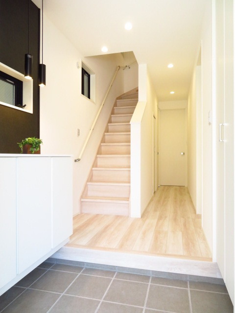 アクセントのある壁紙に、間接照明がオシャレな雰囲気の玄関です♪