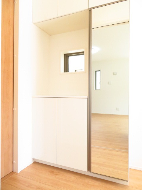 玄関収納には全身が映る鏡が付いているので、コートを着てカバンを持ち、靴を履いた状態でのトータルチェックが出来ますね♪