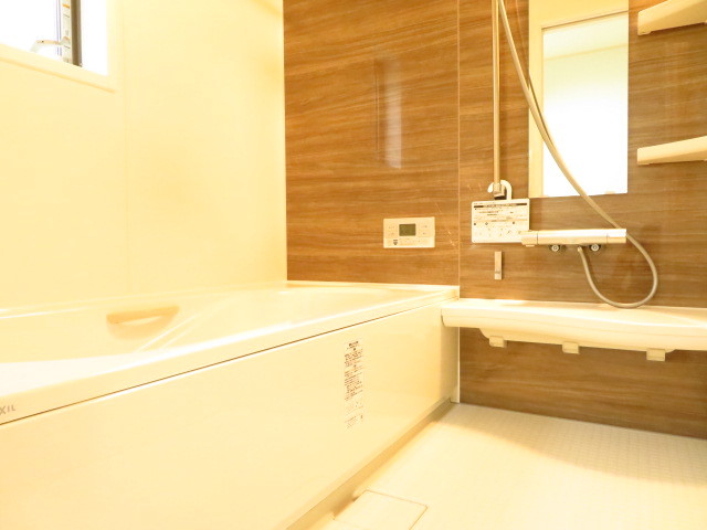 木目調の壁が落ち着いた印象を与えてくれる浴室です。棚や小物を置くスペースもついているので、シャンプーなどを置くのに便利ですね。