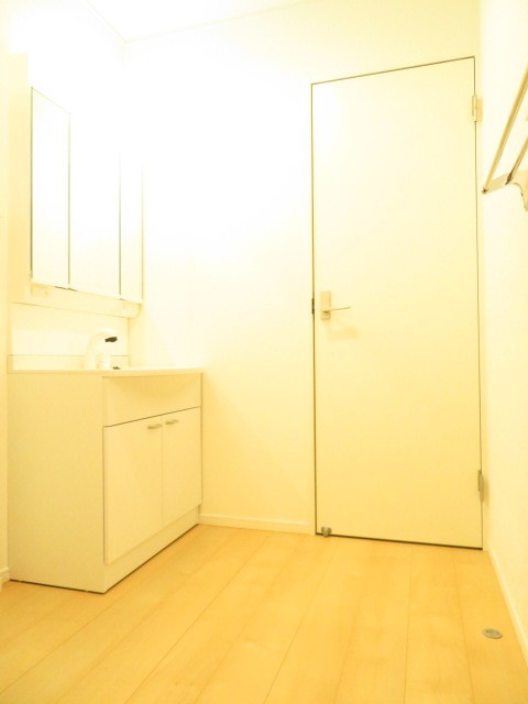 三面鏡にハンドシャワー付き。使いやすい洗面台。浴室の手前には、タオル掛けが取り付けられています。