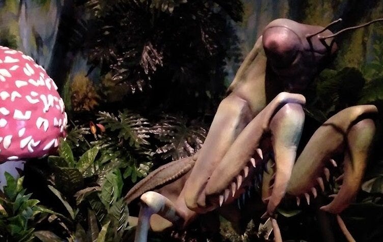 巨大昆虫ロボットが動く「巨大昆虫の森」で記念撮影。