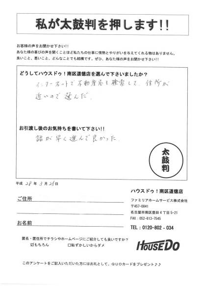 Q:どうしてハウスドゥ!南区道徳店を選んで下さいましたか?